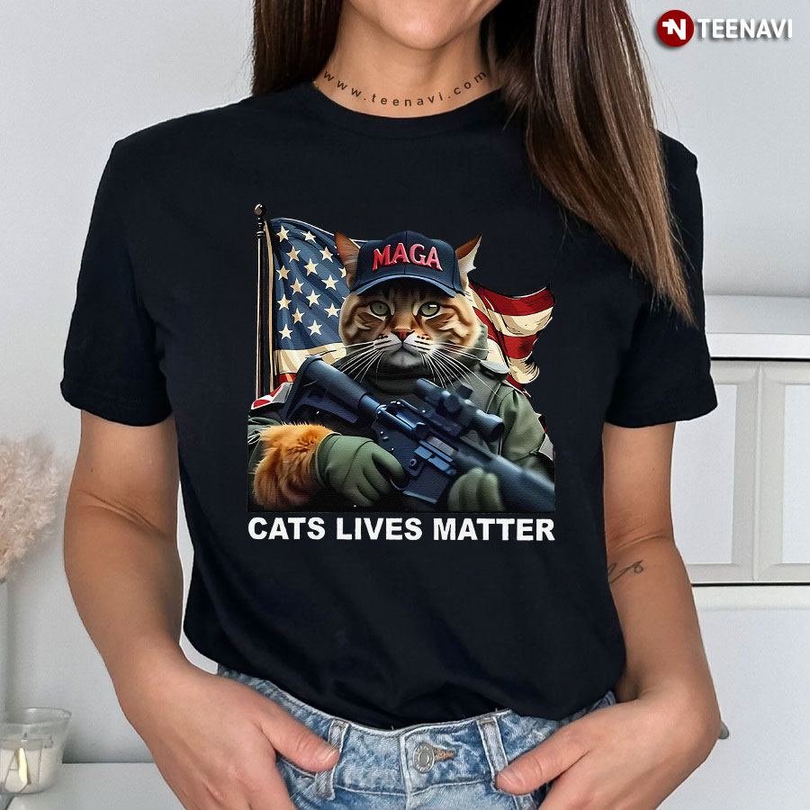 Delivered!The TeeNavi Cats Lives Matter T-Shirt is a bold statement piece combining humor and a powerful message. At its center, a determined cat dons a “MAGA” cap, holding a toy rifle with paws clad in tactical gloves. The background proudly displays the American flag, symbolizing loyalty and patriotism. The phrase “Cats Lives Matter” is playfully emblazoned below, adding a whimsical twist. TeeNavi captures a unique blend of political commentary with feline charisma, allowing wearers to express their stance with a touch of humor. Elevate your wardrobe with this quirky, conversation-starting design.