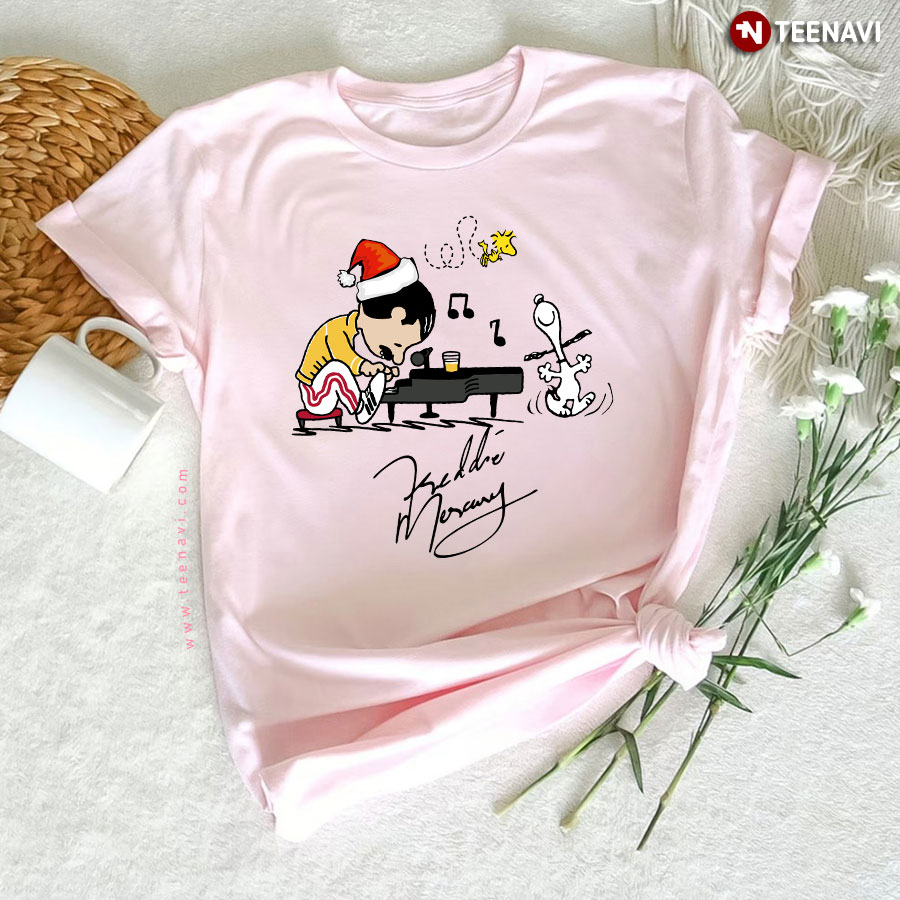 Delivered!Introducing the TeeNavi “Charlie as Freddie Mercury Playing Piano and Snoopy Woodstock T-Shirt” – a whimsical fusion of classic animation and rock ‘n’ roll flair. Imagine Charlie sporting Freddie Mercury’s iconic style, complete with a Santa hat and flamboyant yellow jacket. He’s seated earnestly at a grand piano, channeling the legendary Queen frontman’s energy.