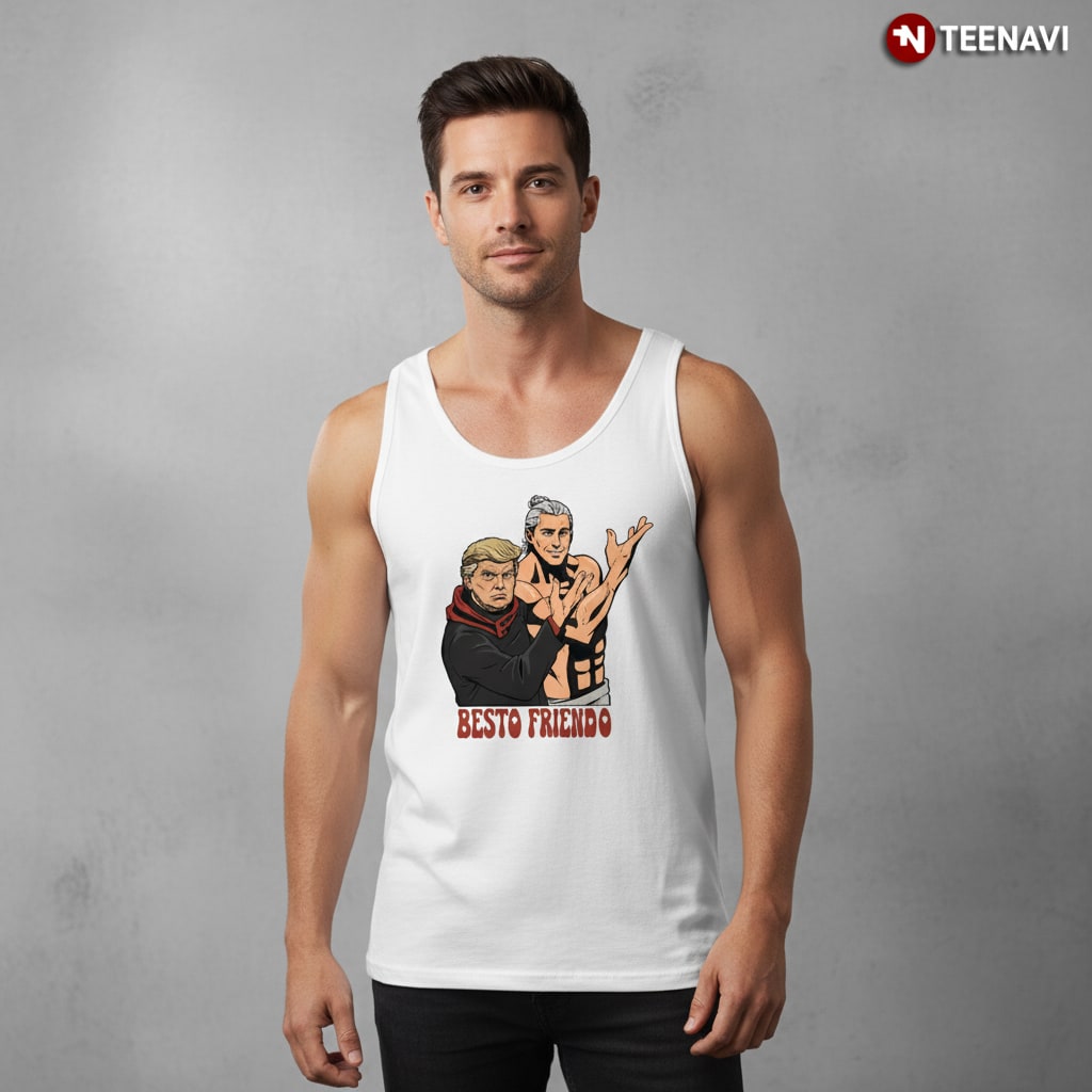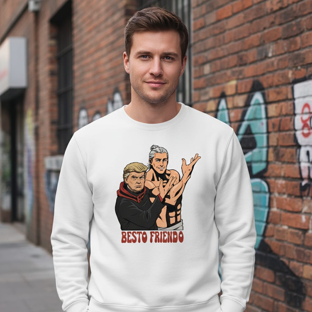 Delivered!Celebrate a legendary, unlikely duo with this hilarious Besto Friendo T-shirt from TeeNavi. Merging the world of political memes with the high-octane energy of Jujutsu Kaisen, this creative design features a caricature of Donald Trump alongside the muscular Aoi Todo in their iconic brotherhood pose. Perfect for anime enthusiasts and fans of internet subcultures, this shirt captures the viral “Besto Friendo” spirit in a bold, comic-book style. Whether you’re a die-hard JJK follower or just love a satirical crossover, this unique tee is a total conversation starter that perfectly blends pop culture and humor for a truly meme-worthy look.
