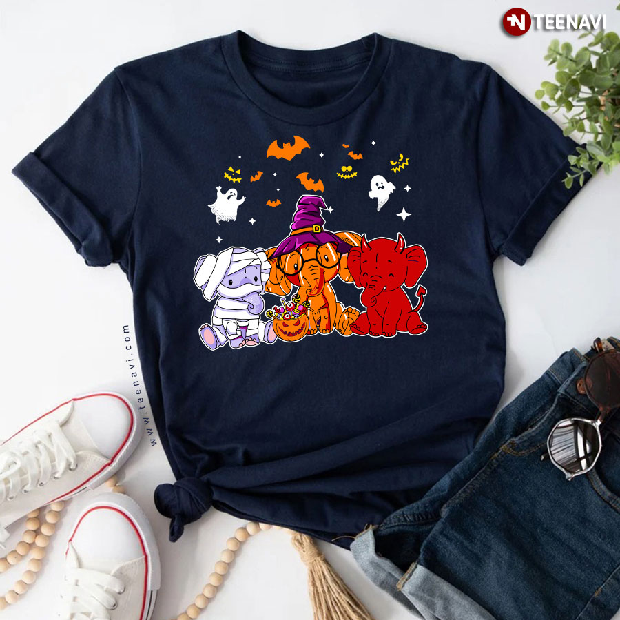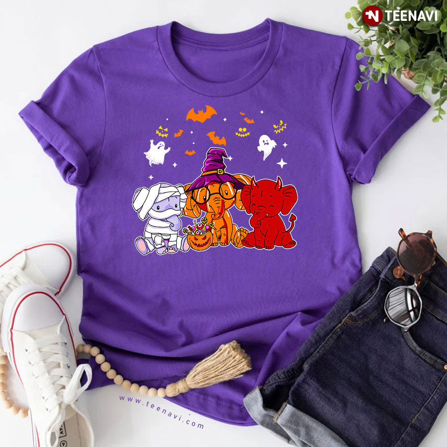 Delivered!Introducing the TeeNavi Elephants Witch Boos and Pumpkin Halloween T-Shirt, a whimsical blend of charm and the spooky spirit of Halloween. This delightful design features three adorable elephants, each dressed in vibrant Halloween costumes. The central elephant, donned in a crooked purple witch hat, takes the spotlight with its playful expression and a festively patterned pumpkin basket at its feet. Flanking it are two elephants: one wrapped mysteriously like a mummy, and the other sporting a cheeky devilish red hue. Surrounding them are fluttering bats and cheeky white ghosts, all enhancing the Halloween ambiance. The TeeNavi brand has captured the joy and creativity of Halloween, making this t-shirt a perfect choice for festive celebrations and those who adore charming, quirky designs. Embrace the fun with TeeNavi and showcase your Halloween enthusiasm with this enchanting tee!