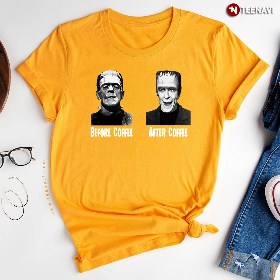 Let’s dive into the specifics of the Funny Frankenstein Before and After Coffee T-Shirt below for more information:
