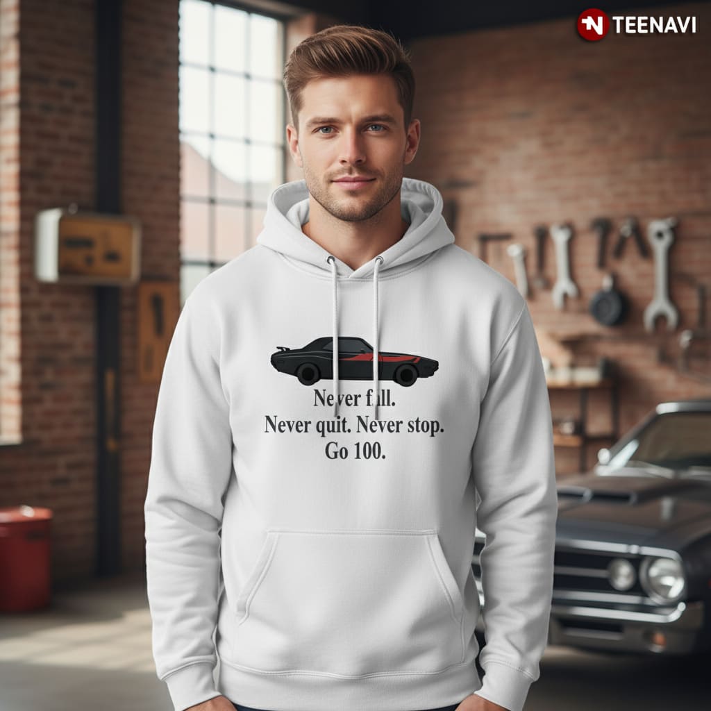 Delivered!Fuel your inner drive with this high-octane muscle car graphic from TeeNavi. Featuring a sleek black performance car with bold red accents, this design captures the raw power and speed of the open road. The motivational mantra “Never fall. Never quit. Never stop. Go 100.” serves as a powerful reminder for gearheads and go-getters to keep pushing forward at full throttle. Whether you’re a racing enthusiast, a classic car lover, or someone who lives life in the fast lane, this tee perfectly blends automotive passion with a relentless spirit of determination. It’s the ultimate statement piece for those who refuse to slow down and always aim for the finish line.