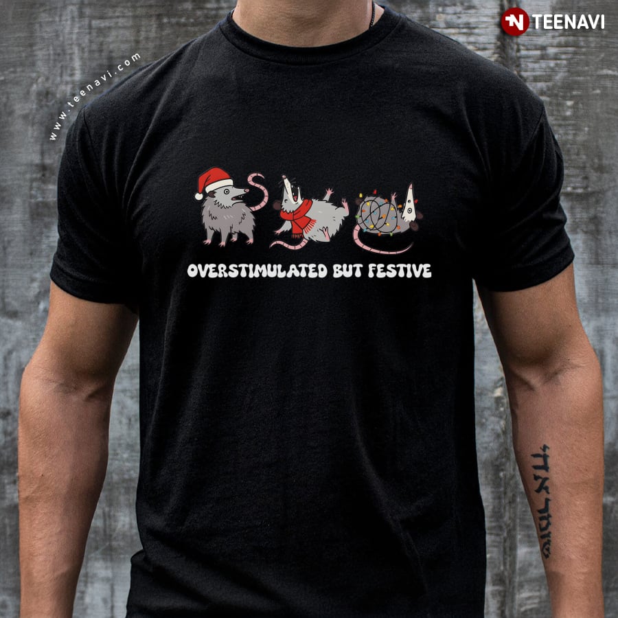 Let’s dive into the specifics of the Overstimulated But Festive Possum Christmas T-Shirt below for more information: