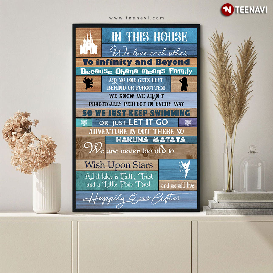 The TeeNavi Vintage Disney “In This House We Love Each Other To Infinity And Beyond” Poster beautifully captures the enchanting essence of Disney magic, perfect for any fan’s decor. This exquisitely designed poster incorporates a rich tapestry of beloved Disney quotes, each vividly painted on wooden slats. The enchanting phrases range from “Ohana means family” to the daring “Adventure is out there,” evoking a sense of wonder and familial warmth. Key phrases like “Hakuna Matata” and “Just Keep Swimming” inspire resilience and joy. Adorned with subtle silhouettes of iconic Disney characters, TeeNavi’s poster is a celebration of love, adventure, and infinite possibilities, promising a happily ever after within your own home.